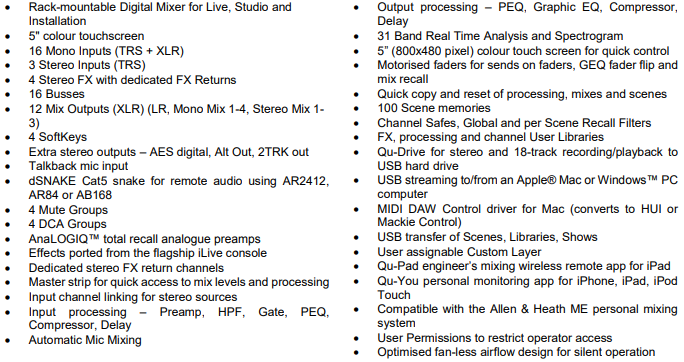 Qu-16 features sixteen AnalogiQTM digitally controlled preamps with advanced zero-crossing detection and a padless 1dB-step gain stage, which have been closely allied to the DSP for optimal gain accuracy and audio transparency. The analogue signal is captured by high-class, low latency 24bit analogue to digital converters, which are matched to 24bit digital to analogue converters to deliver the required high quality output. The AnalogiQTM preamp design has been refined to offer superb transparency, minimal distortion and an ultra-low noise floor, with a warm, musical sound that is missing from some digital consoles.