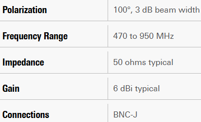 Pair of UHF wide-band directional LPDA (log periodic dipole array) antennas provide enhanced signal pickup for UHF wireless systems throughout a wide band range (470-950 MHz). Each antenna paddle is matched to 50 ohms impedance with an integral high-quality low-loss BNC connector; 6 dB gain. For permanent or temporary installation; mounts to 5/8"-27 threads.