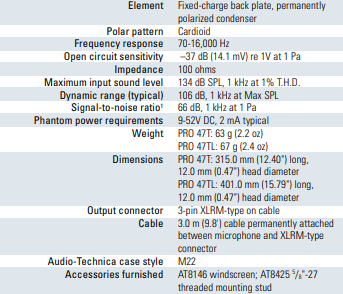 The PRO 47T is a wide-range condenser microphone with a cardioid polar pattern. It is designed to provide clear, intelligible sound reproduction in a wide range of settings, such as conferences, courtrooms, houses of worship and other demanding sound pickup applications.