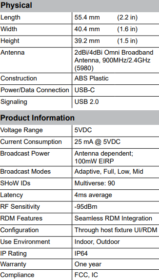 Multiverse Connect Modules include seamless RDM integration and can be configured through host fixture UI/RDM. The Multiverse Connect Modules uses a USB Type-C Plug connector and runs on 5VDC. The Multiverse Connect Module is IP64 rated and can be used in an indoor or outdoor environment.