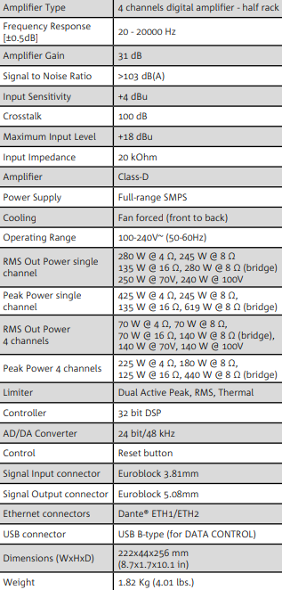 IA504D is the new dBTechnologies professional amplifier for passive speakers with integrated Dante® interface for a remote in-depth control and configuration using AURORA NET software. The device is equipped with a powerful amplifier section, capable of handling up to 500 W (RMS power) in 4 channels and controlled by a DSP, which can perform a detailed customization of the output of the speakers. The mechanical design allows an easy, accurate and quick installation in half, 1U rack or flat surface thanks to the optional brackets. In addition, the user can load presets for dBTechnologies passive speakers using AURORA NET software to provide an excellent listening experience.