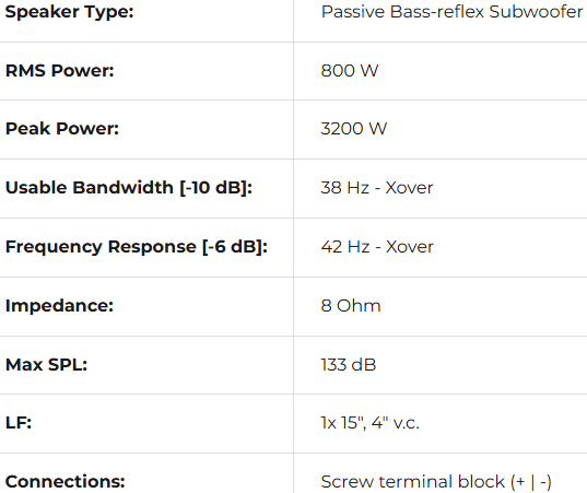 - FREQUENCY RESPONSE [-6dB]: 42 Hz - Xover