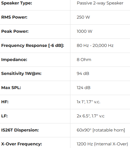 IS26T-WP is a full-range 2-way passive speaker with two 6.5'' woofers and a 1'' compression driver for the high range.