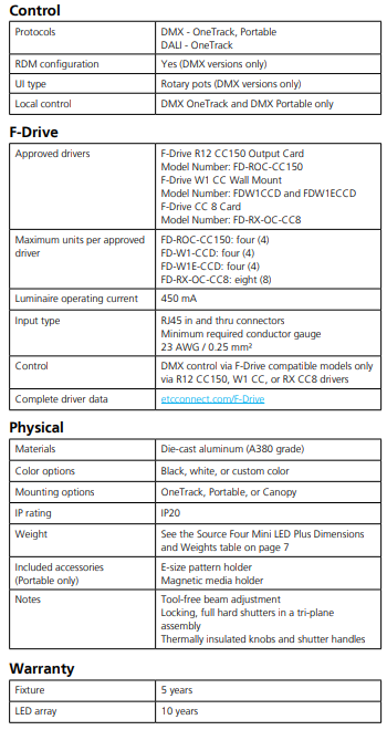 The Source Four Mini LED Plus features the same crisp optics, user-friendly functionality, and sleek look of the legendary Source Four and Source Four Mini fixture but with a much higher output than the standard Source Four Mini LED. This compact fixture is ideal for architectural and other small installation applications, including use with DMX, F-Drive, and DALI.