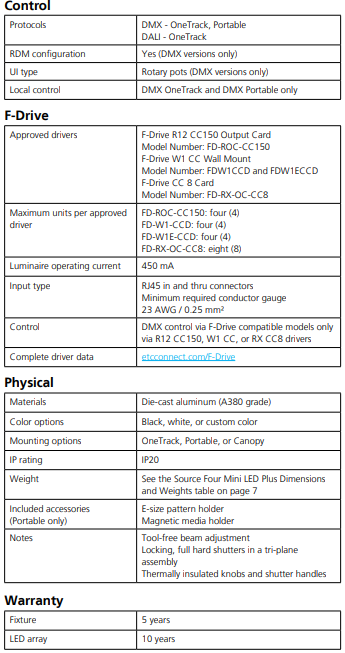 The Source Four Mini LED Plus features the same crisp optics, user-friendly functionality, and sleek look of the legendary Source Four and Source Four Mini fixture but with a much higher output than the standard Source Four Mini LED. This compact fixture is ideal for architectural and other small installation applications, including use with DMX, F-Drive, and DALI.