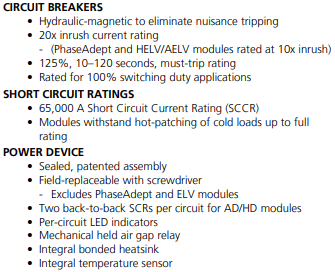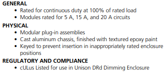 Unison DRd power modules are designed for use in all DRd enclosures. Whether you need forward-phase or reverse-phase SCR dimming, relay control, or specialty power control Unison DRd has you covered. Most modules provide two circuits of control for a wide range of applications. All modules feature modular installation and removal, fully magnetic circuit breakers, and rock-solid construction.