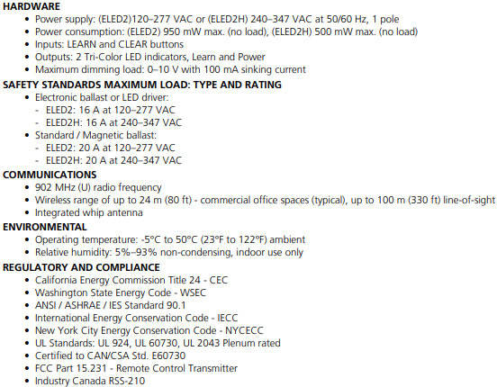 All ELED2 models deliver common lighting control sequences based on occupancy state, switch action, timeclock, gateways, ambient light, and correlated color temperature (CCT) levels.