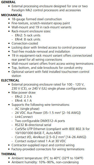 The ERn Mk2 External Enclosure line offers a wall- or rack-mount cabinet for your P-ACP-E Mk2 processors. The ERn is offered in different enclosure sizes and mounting options to meet each projects specifications. ERns offer a range of accessories including RideThru, redundant power supplies, integrated network switch, and an integrated Paradigm P-TS7 touchscreen.