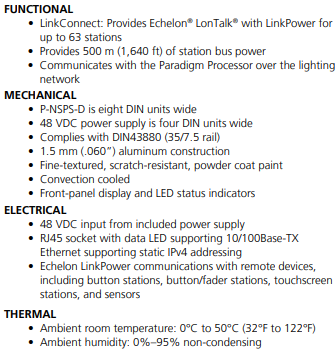 The Paradigm Network Station Power Supply provides station bus power and data for up to 63 stations with only a network connection to your Paradigm Processor. Adding stations to your system that are outside the distance limit of the LinkConnect bus is simple by adding a P-NSPS-D anywhere you have a network port. Each Paradigm Architectural Control Processor can support up to five Network Station Power Supplies and up to 128 total stations and sensors.