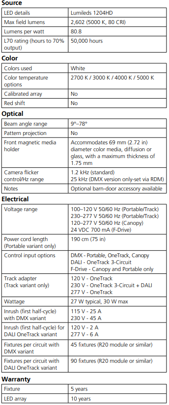 The soft beam output supports an optional barn door and provides high-performance dimming utilizing an onboard dimming engine, DMX control, or F-Drive compatibility; the OneTrack versions also support DALI.