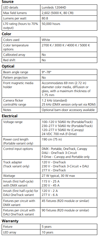 The soft beam output supports an optional barn door and provides high-performance dimming utilizing an onboard dimming engine, DMX control, or F-Drive compatibility; the OneTrack versions also support DALI.