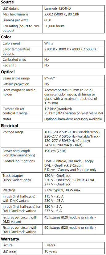 The soft beam output supports an optional barn door and provides high-performance dimming utilizing an onboard dimming engine, DMX control, or F-Drive compatibility; the OneTrack versions also support DALI.