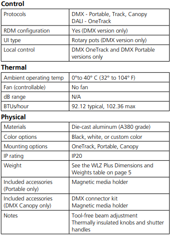 The soft beam output supports an optional barn door and provides high-performance dimming utilizing an onboard dimming engine, DMX control, or F-Drive compatibility; the OneTrack versions also support DALI.