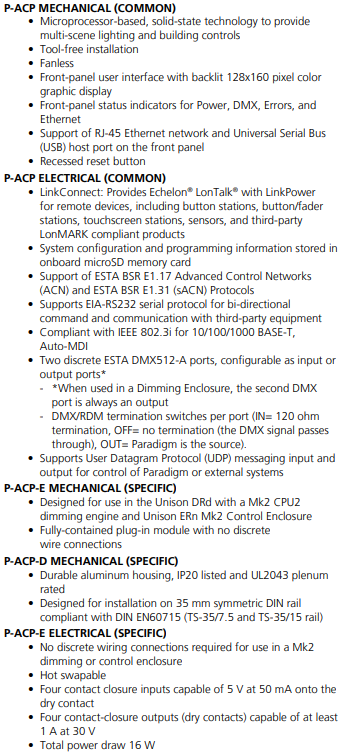 The Paradigm Processor is available in an enclosure-mount form factor (P-ACP-E) for centralized dimming and control installations and is available in a DIN rail mounted form factor (P-ACP-D) to accommodate a distributed control system.