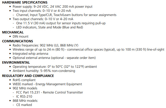 The UIO has two hardware input channels which support 0–10 V or 4–20 mA transmitters. Inputs have associated wireless output channels so the analog or digital signal present on the input can be transmitted by different wireless message types. Connected HVAC, building automation, or other third-party wired sensors can have sensor values broadcast wirelessly. In addition to gateways or controllers, another UIO can be linked to reproduce a sensor’s analog or digital value.