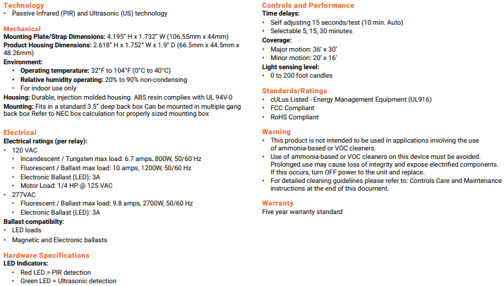 ILC ONW-D-1001-DMV-W Wall Switch Sensor - Dual Tech - Line Voltage - No Neutral - Dual Relay - White