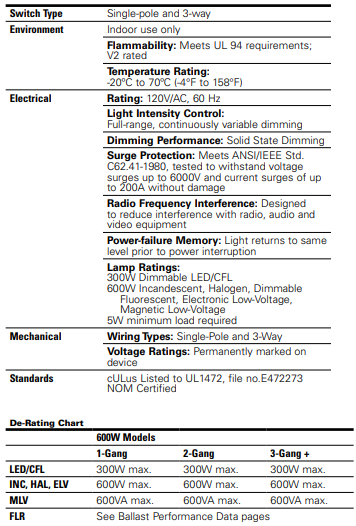 The Multi-load Decorator Dimmer provides full-range classic linearslide dimming for 300W dimmable LED and CFL as well as 600W Incandescent, Halogen, Dimmable Fluorescent, Electronic Low-Voltage & Magnetic Low-Voltage light sources. Preset units feature a preset “ON/OFF” switch that automatically returns controlled light(s) to a preset level without disturbing the brightness level. The device is designed for both Single-Pole (one location) and 3-Way (multi-location) applications, and features an adjustable Rapid-Start setting which provides additional power for a brief time period to ensure lamp start-up at low dim settings.