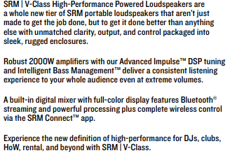 Overview Product Videos Documentation Product Description Mackie SRM212-V-CLASS-U 12” 2000W High-Performance Powered Loudspeaker Overview Specifications Product Videos Videos Hide Videos Show Videos Mackie SRM V-Class Overview: Studio Sound Takes the Stage We love to brag about Mackie SRM V-Class. They’re our most adv... Custom Field Product Reviews Data Sheet
