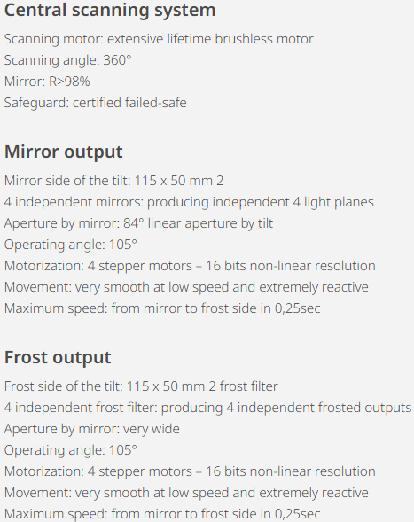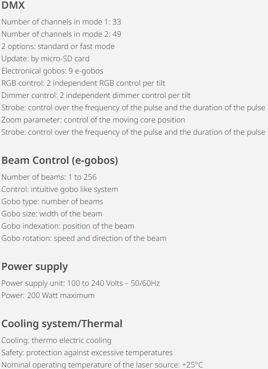Its DMX control allows access to 9 beam patterns with an electronic gobbo system. 1 beam, 2 beams, 4, 8, 16, 32, 64, 128, and up to 256 beams. With control over beam sizes, indexing, and rotation for each pattern. With 2 dimmers per tilt, 2 RGB parameters per tilt. Complemented by a shutter. a set up of IVL Dice never ceases to amaze.