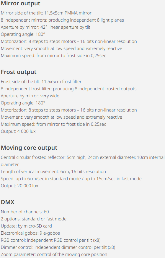 This technology-packed luminaire is the result of 5 years of R&D dedicated to giving smaller productions the magnitude of big arena experiences. With its innovative moving core combined with the renowned 8 tilts system (2 sides by tilt, mirror and frost), the IVL Photon has 3 main outputs: