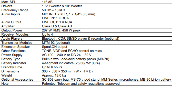 - Mixed input amplification of wired mic, wireless mic, and audio players.