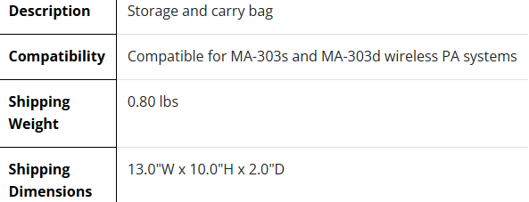The MIPRO SC-30 is a storage and carry bag compatible for MA-303s and MA-303d wireless PA systems. It has pouches for transmitters and other accessories.