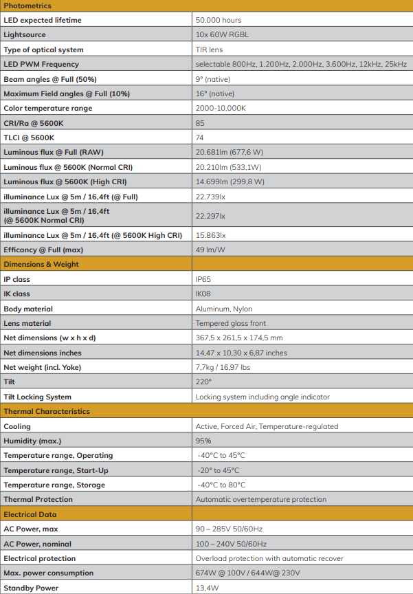 Illuminate your world with NEO mini, a cutting-edge lighting fi xture that combines unparalleled performance with versatility and convenience. With 10 x 60W RGBL LEDs, NEO mini generates an astounding 22739lx@5m, calibrated at 5600K, ensuring your space is bathed in brilliant light. Crafted with precision, the fi xture features a specially developed 9° TIR lens, ensuring high illuminance even over extended distances while guaranteeing seamless color mixing for captivating displays. Enhance your lighting setup further with optional magnetic fi lters, offering a range of circular and elliptical beam angles, along with a smoked clear fi lter tailored for impeccable camera applications.