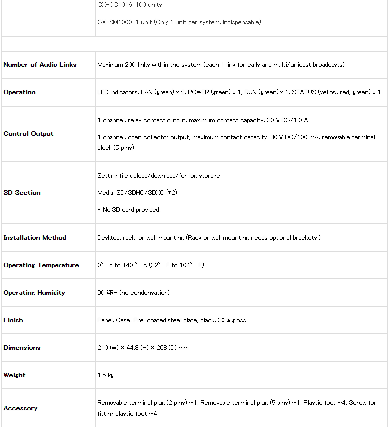 It can set up a matrix system in combination with the intercom stations, Audio interface, amplifier units, and touch screen remote microphone of the CX-1000 series, enabling conversations and broadcast controls. Up to 3000 stations can be connected within a system. It is equipped with a Failure detection function and a network redundancy function, allowing you to build a highly reliable system. The CX-SM1000 is equipped with a WEB server, which enables you to configure various settings from a browser. A built-in SD card slot allows for uploading and downloading the system settings and downloading the operation history.