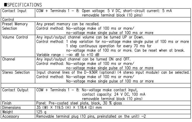 The D-981 is a remote control module designed for use with the D-901 Digital Mixer, etc. It permits preset memory recall, input/output channel volume control, stereo input selection and channel ON/OFF operation to be remotely controlled from external equipment. Tally output can also be provided for external control.