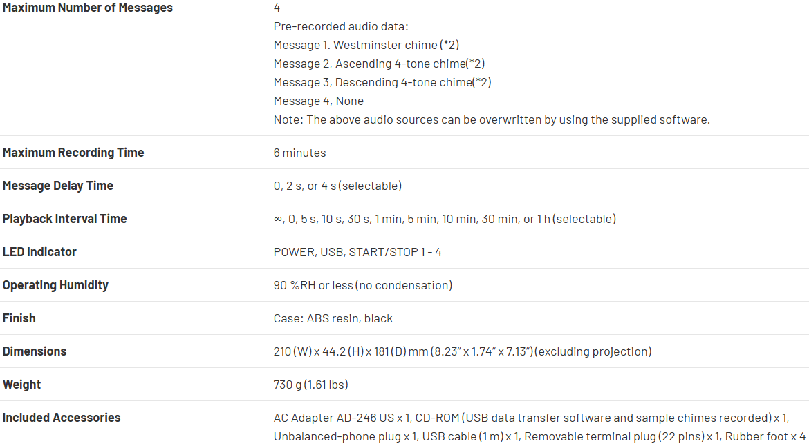 - Up to 4 different messages can be stored in a built-in flash memory and played back.