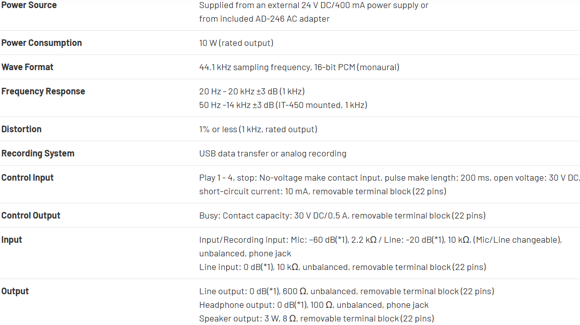 The EV-20RPS kit is a convenient addition to sites where the same message or music is repeatedly broadcast. Up to 4 types of music and messages (6 minutes total time) can be recorded and played back. The USB port facilitates recording by transferring the supplied sound sources from a PC to the unit. The unit's small built-in amplifier enables small-scale broadcasts through a simple speaker connection. Includes AC adapter.