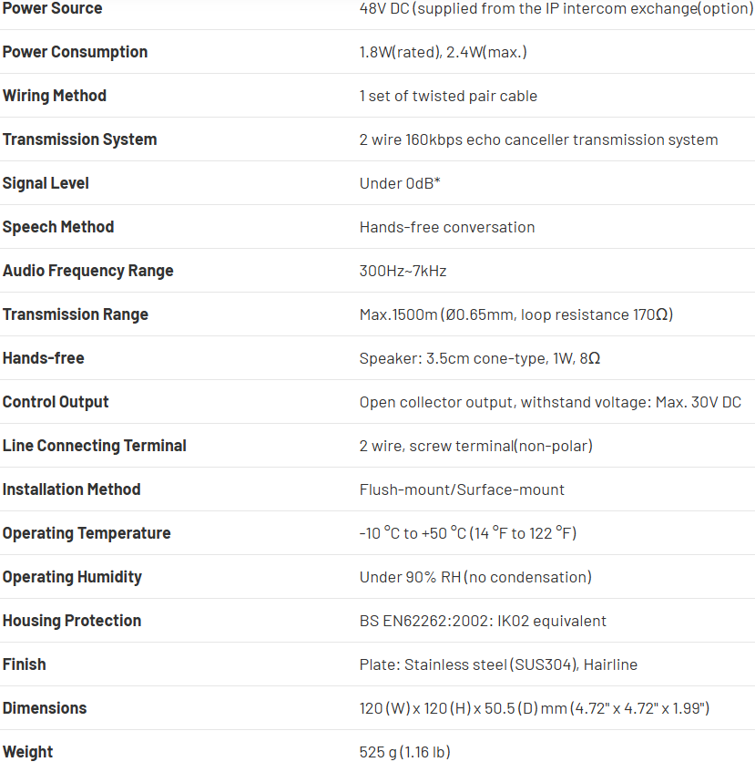 Designed to connect to the IP Intercom Exchange, the N-8052DS is a door station featuring high quality hands-free conversation. It has a contact output (momentarily closed) to remotely control an electronic door lock. The operating temperature range is -10℃ to +50℃. As provided with guard nets inside to cover over the openings of microphone and speaker, the N-8052DS can be installed free from care in public space.